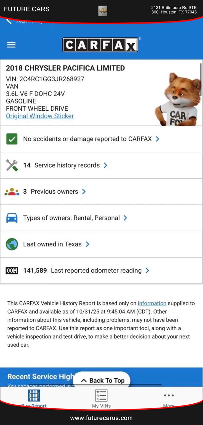 Vehicle Inquiry for 2018 Chrysler Pacifica Limited Minivan 4D
